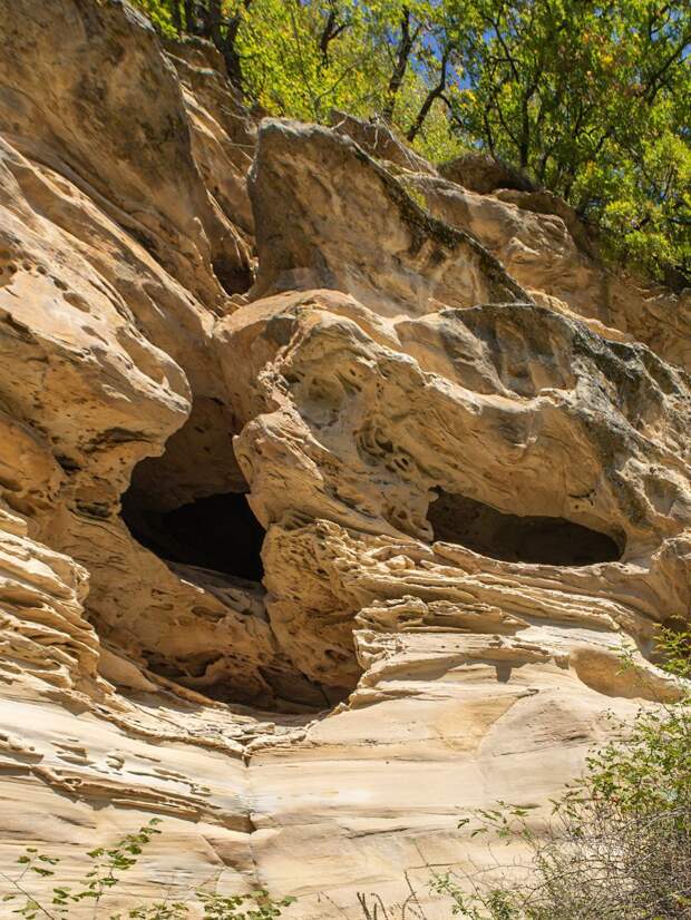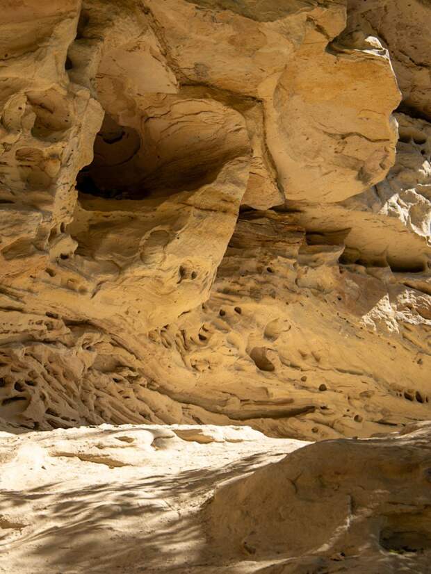 В течение тысячелетий ветер и осадки разрушали мягкую породу, создав поверхность, испещренную дырами и туннелями, которые поразительно напоминают головку швейцарского сыра или «Маасдам». Пещерный комплекс протянулся примерно на десять метров вглубь и состоит из нескольких гротов, соединенных узкими проходами. Это даже сквозная пещера — можно зайти с одной стороны и выйти с другой!